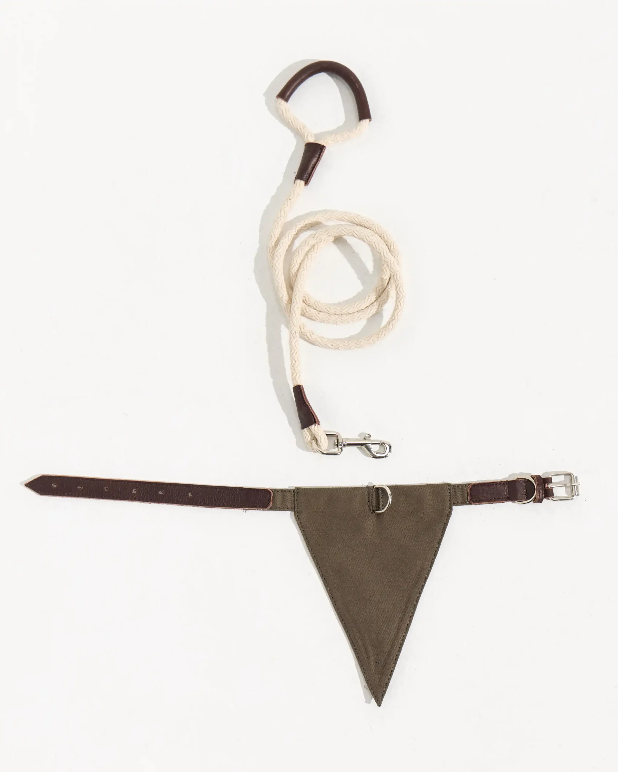 Kit de 3 piezas para tu mascota o para regalar. Este set consiste en un collar de cuero, acompanado con un panuelo desmontable + correa.